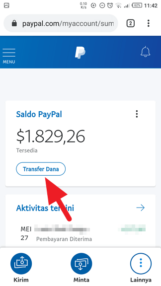 1. Masuk ke halaman depan PayPal, lalu pilih Transfer Dana.